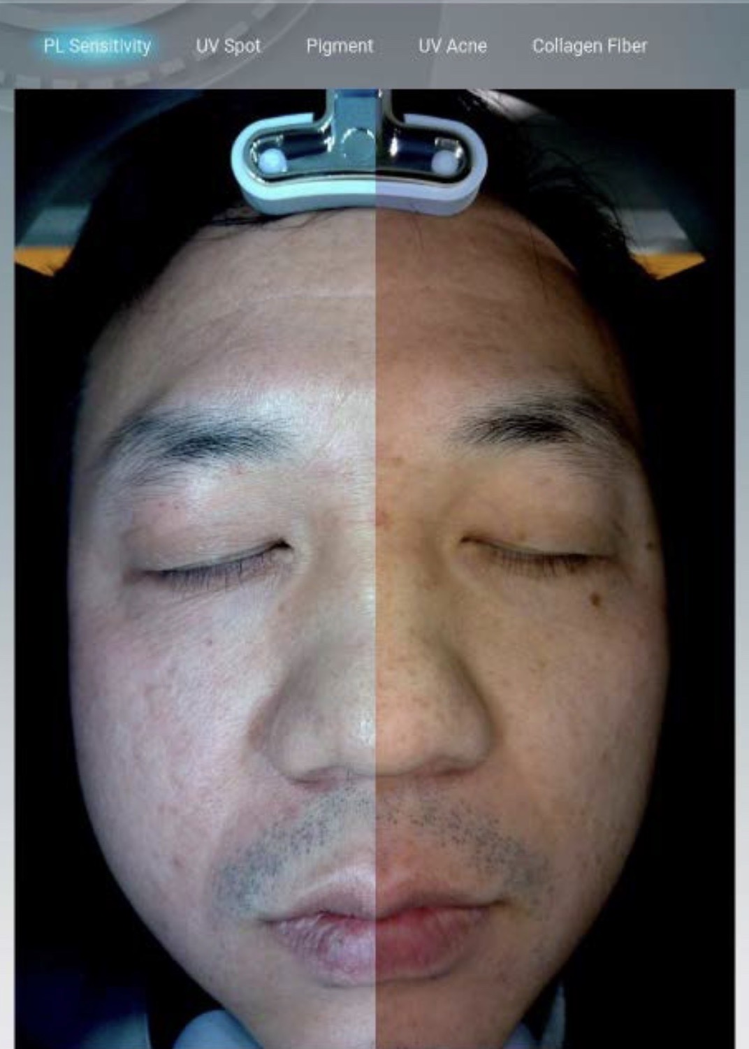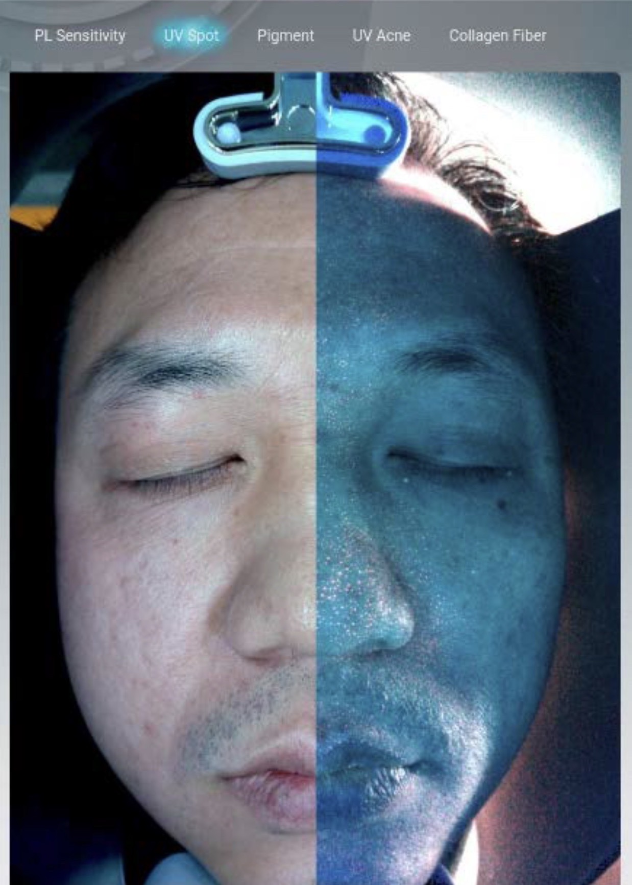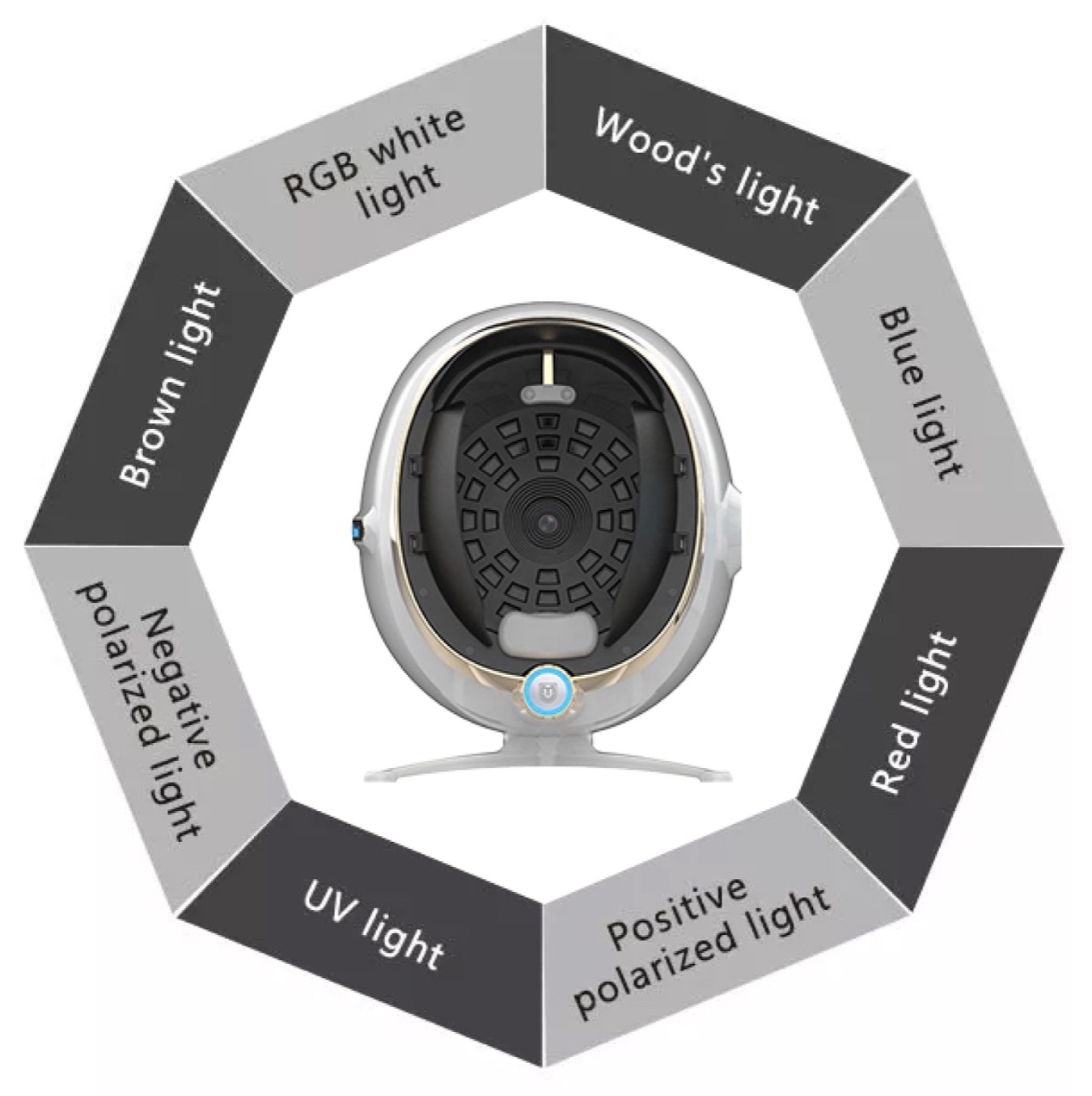 The Skin Lab AI Skin Tester captures facial images using industrial-grade HD cameras and 8 light sources: white, Wood’s, blue, red, positive and negative polarised light, UV and brown light.