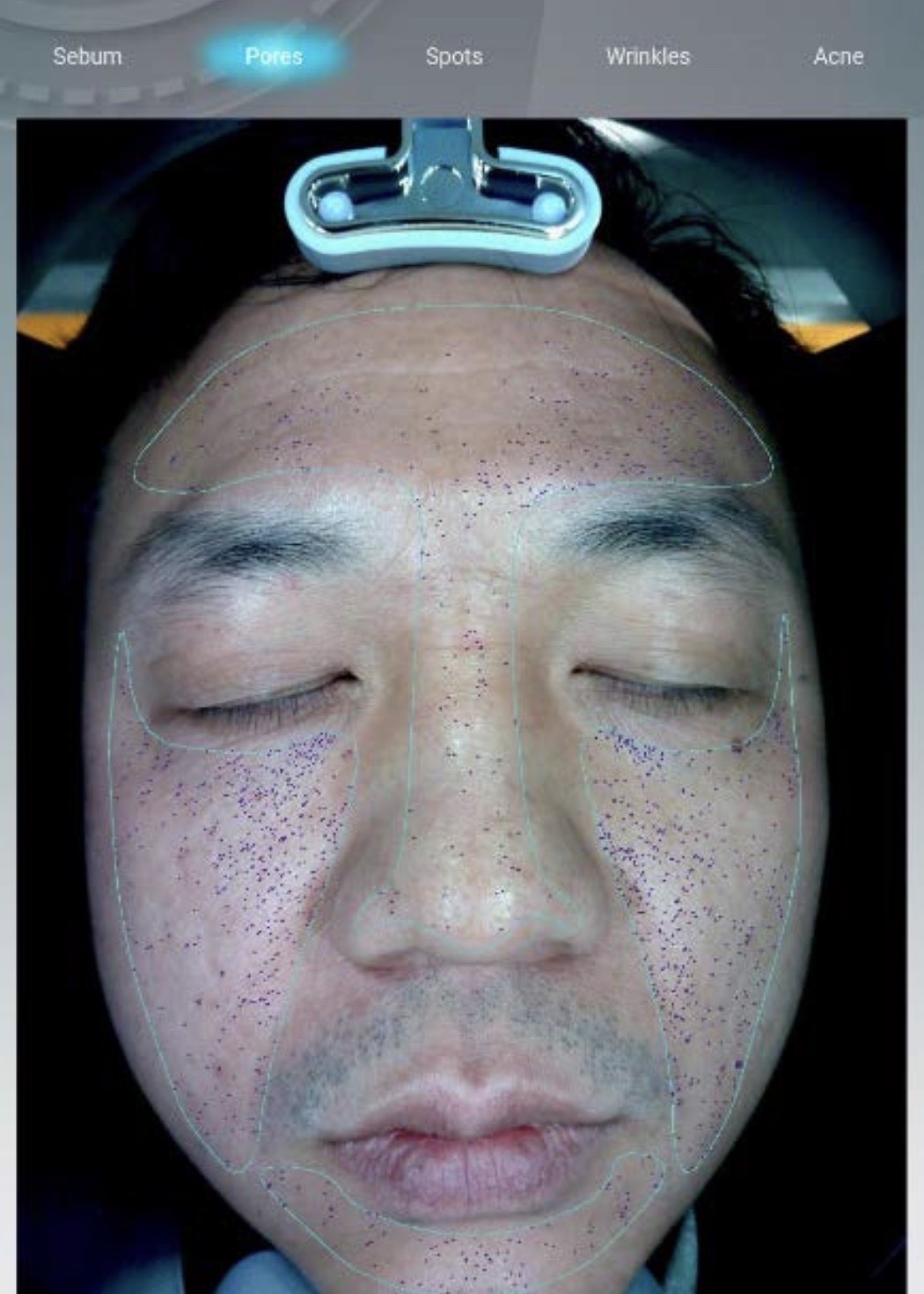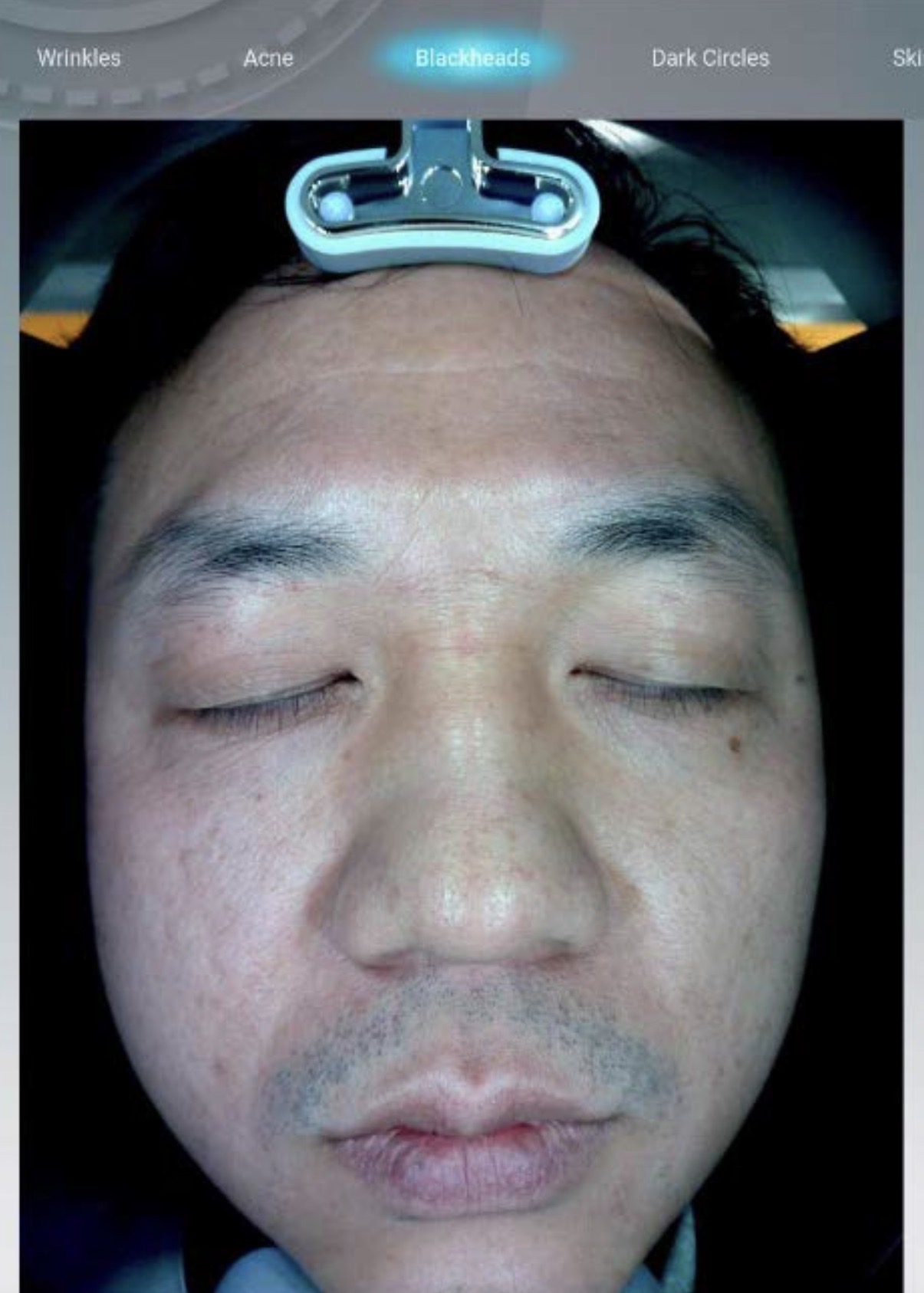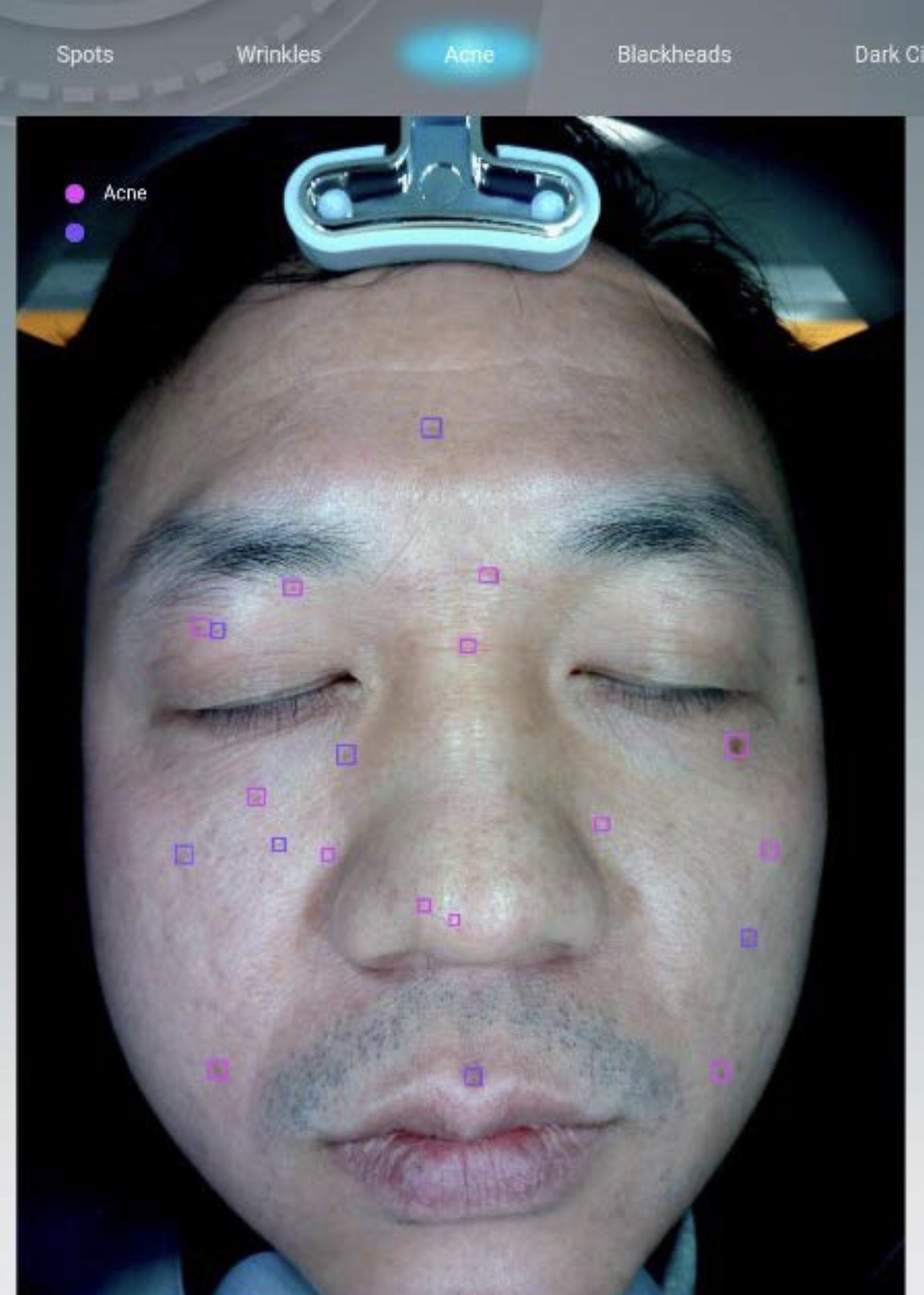 The Skin Lab AI Skin Tester captures facial images using industrial-grade HD cameras and 8 light sources: white, Wood’s, blue, red, positive and negative polarised light, UV and brown light.