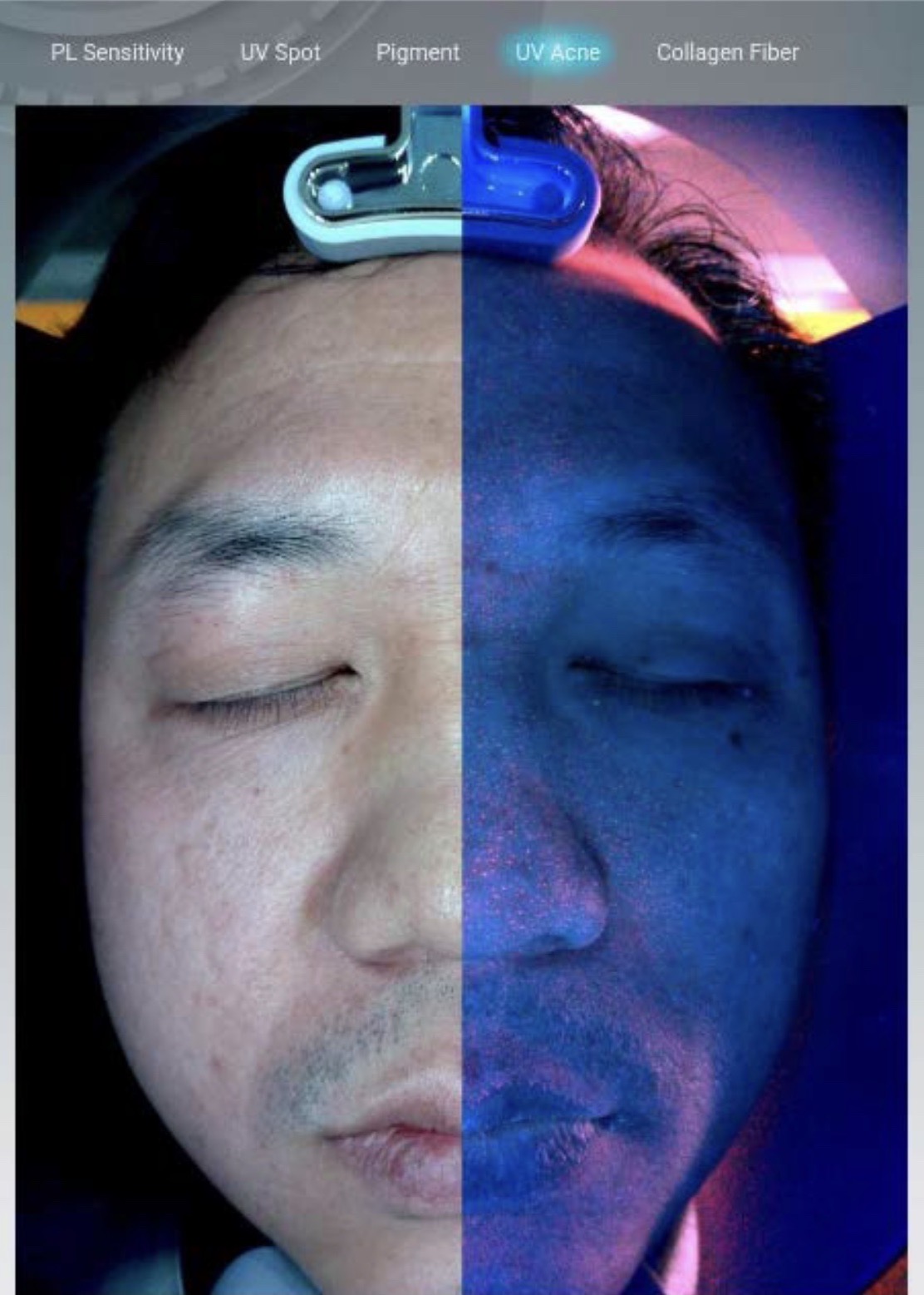 - Acne UV (UV mode): highlights P. acnes via fluorescence.