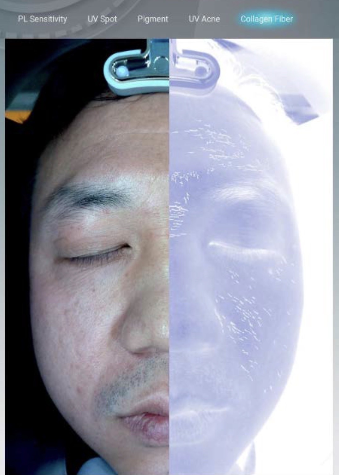 - Collagen (UV mode): indicates collagen/elastin distribution and depletion.